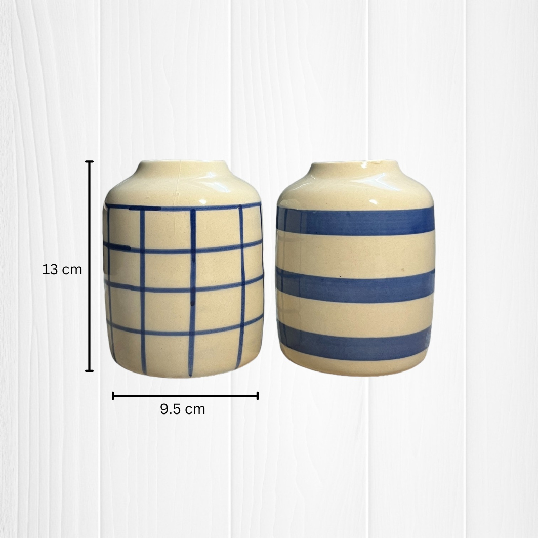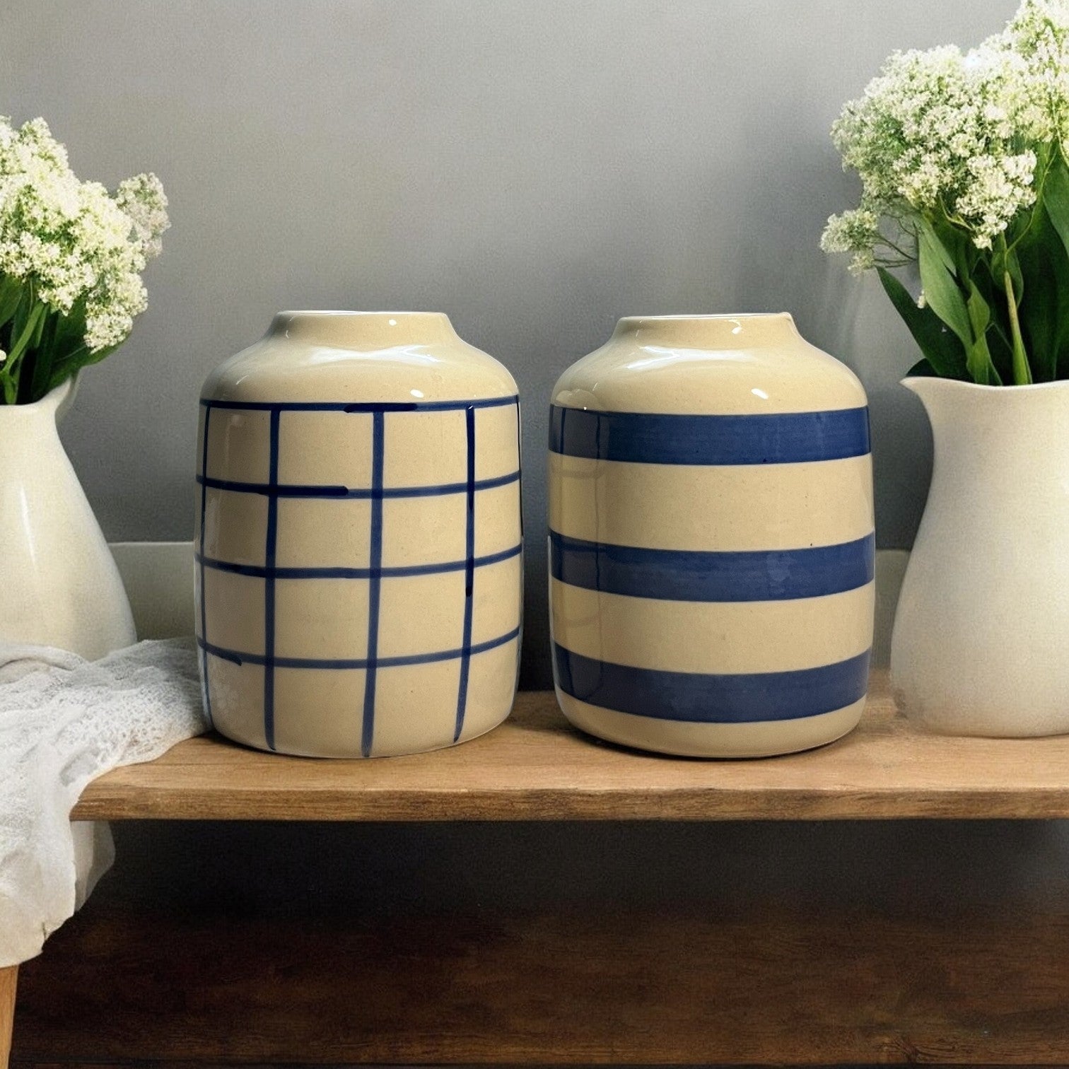 Bring a touch of coastal charm to your home with our Coastal Twins Ceramic Vases. This delightful set of two vases features a harmonious blend of classic beige and vibrant blue patterns, each with a unique design – one with a grid pattern and the other with horizontal stripes. Perfect for adding a nautical flair to any room, these vases are both stylish and versatile.