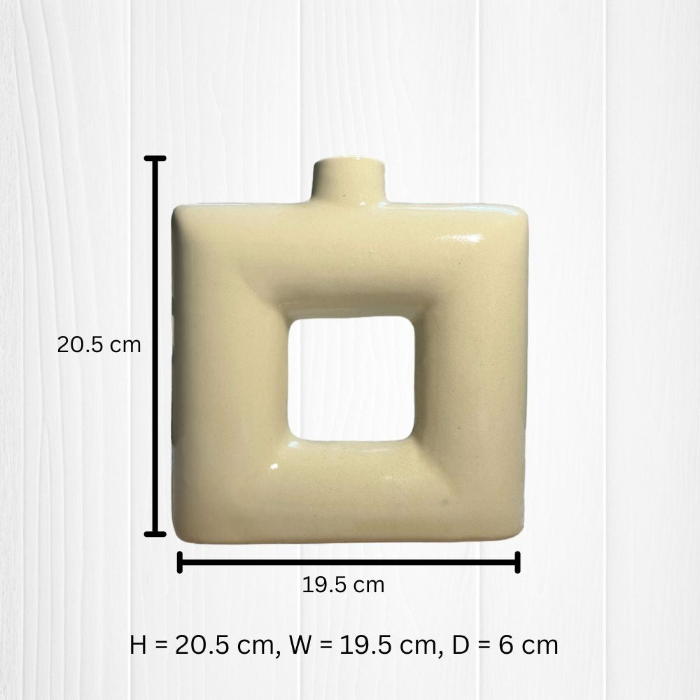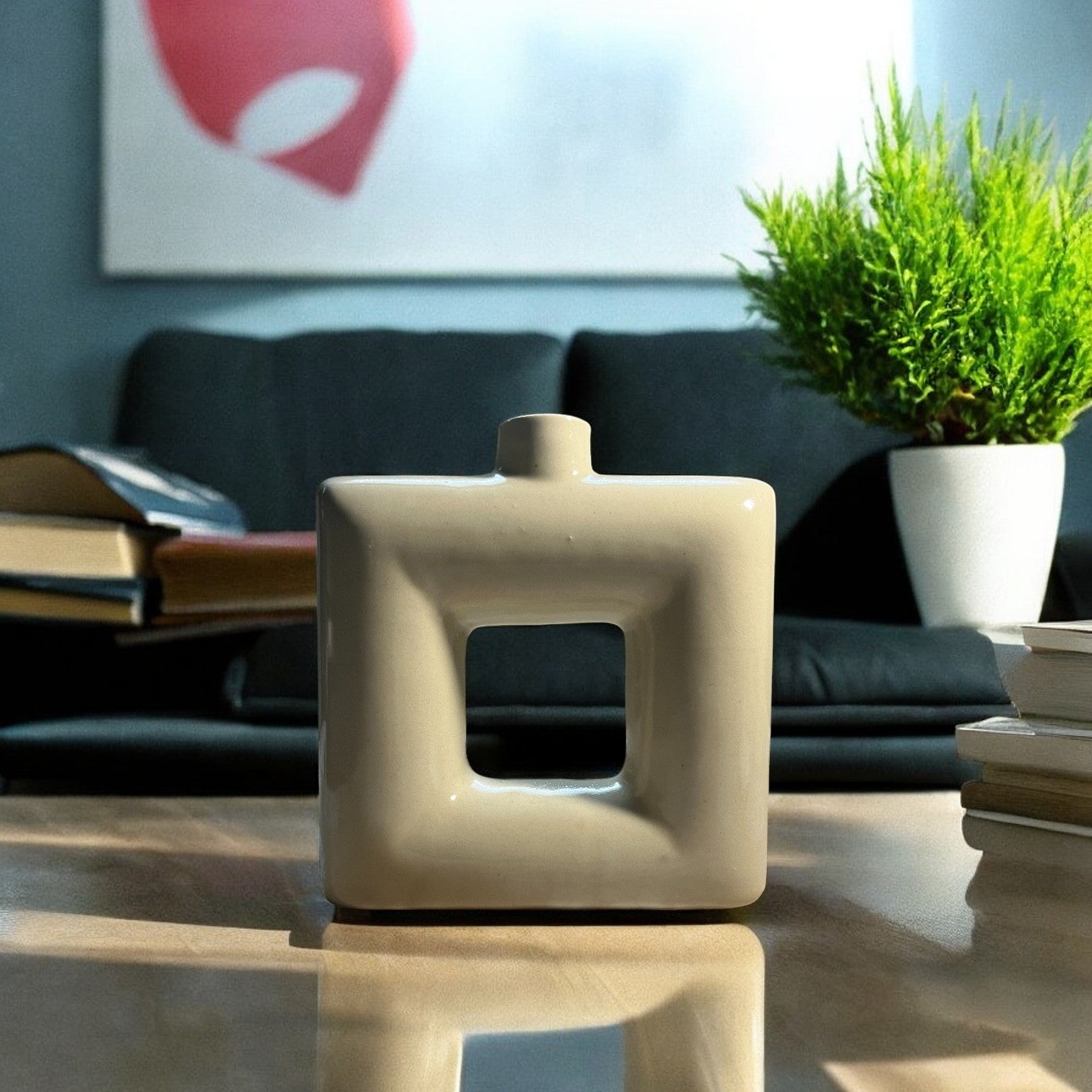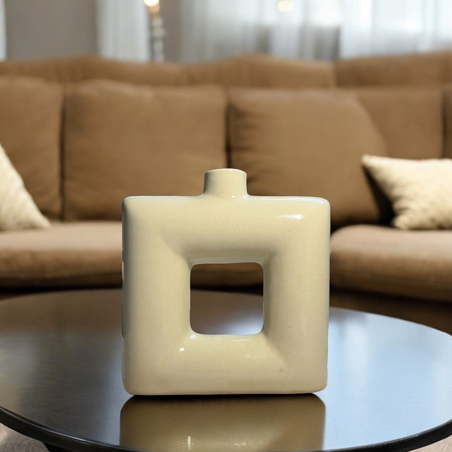 Introduce a modern touch to your home decor with the Dune Delight Ceramic Vase. This unique piece features a contemporary square design with a central cut-out, finished in a soft, neutral beige tone. Perfect as a standalone piece or as part of a decorative arrangement, this vase adds a distinctive flair to any setting.
